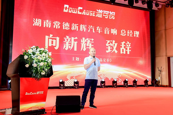 湖南常德新輝汽車音響總經(jīng)理向新輝上臺發(fā)言,他以自身多年門店運(yùn)營經(jīng)驗(yàn),為嘉賓帶來“門店產(chǎn)品定位”的主題分享。